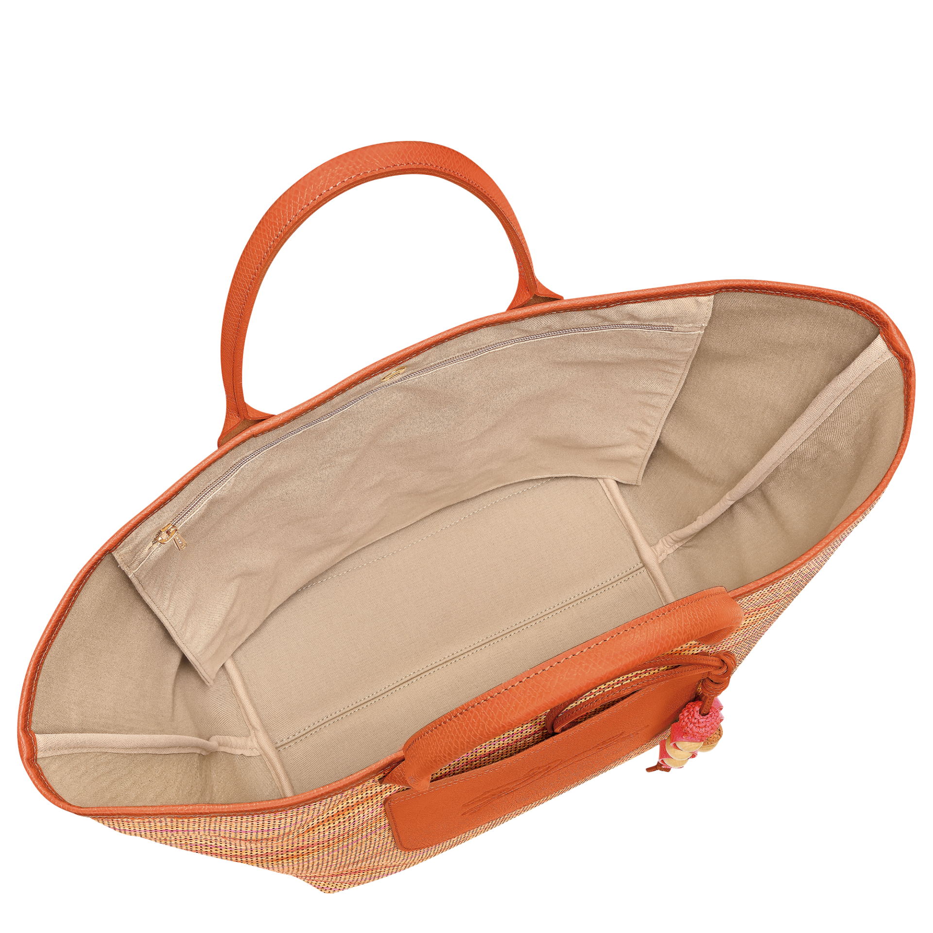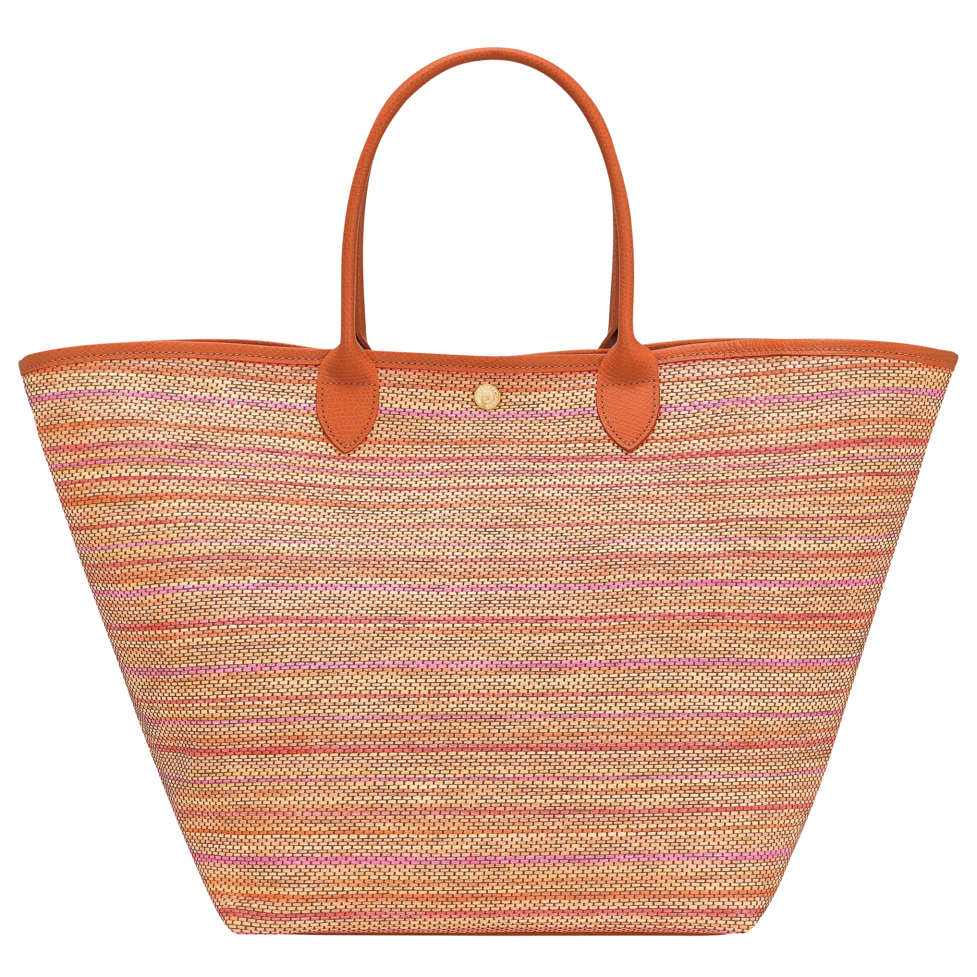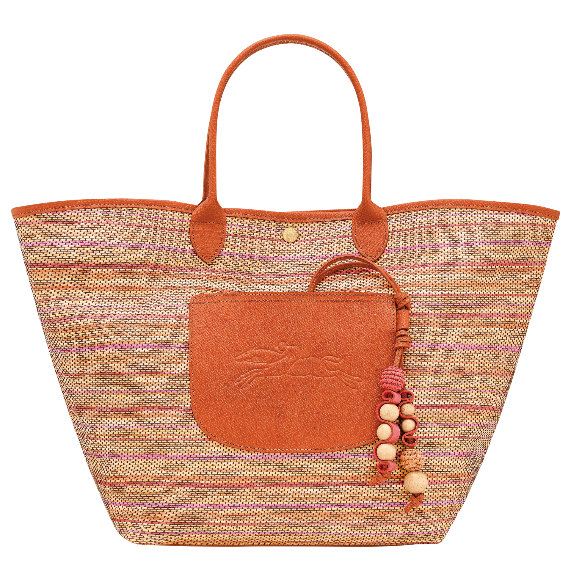 Le grand Panier Pliage réinvente le sac panier classique avec une touche fraîche et ensoleillée. Confectionné en toile effet paille, il dévoile un dégradé arc-en-ciel éclatant, évoquant les ciels d’été et les tapis colorés des plages. Il se pare de finitions en cuir raffiné et d’un grigri artisanal composé de perles de bois et d’un cordon de cuir souple, rappelant le mouvement ondulant des vagues. Pensé pour un style estival sans effort, il est doté d’une fermeture à pression, une poche plate extérieure, une poche zippée intérieure, ainsi qu’un grigri amovible qui peut accueillir un charms
