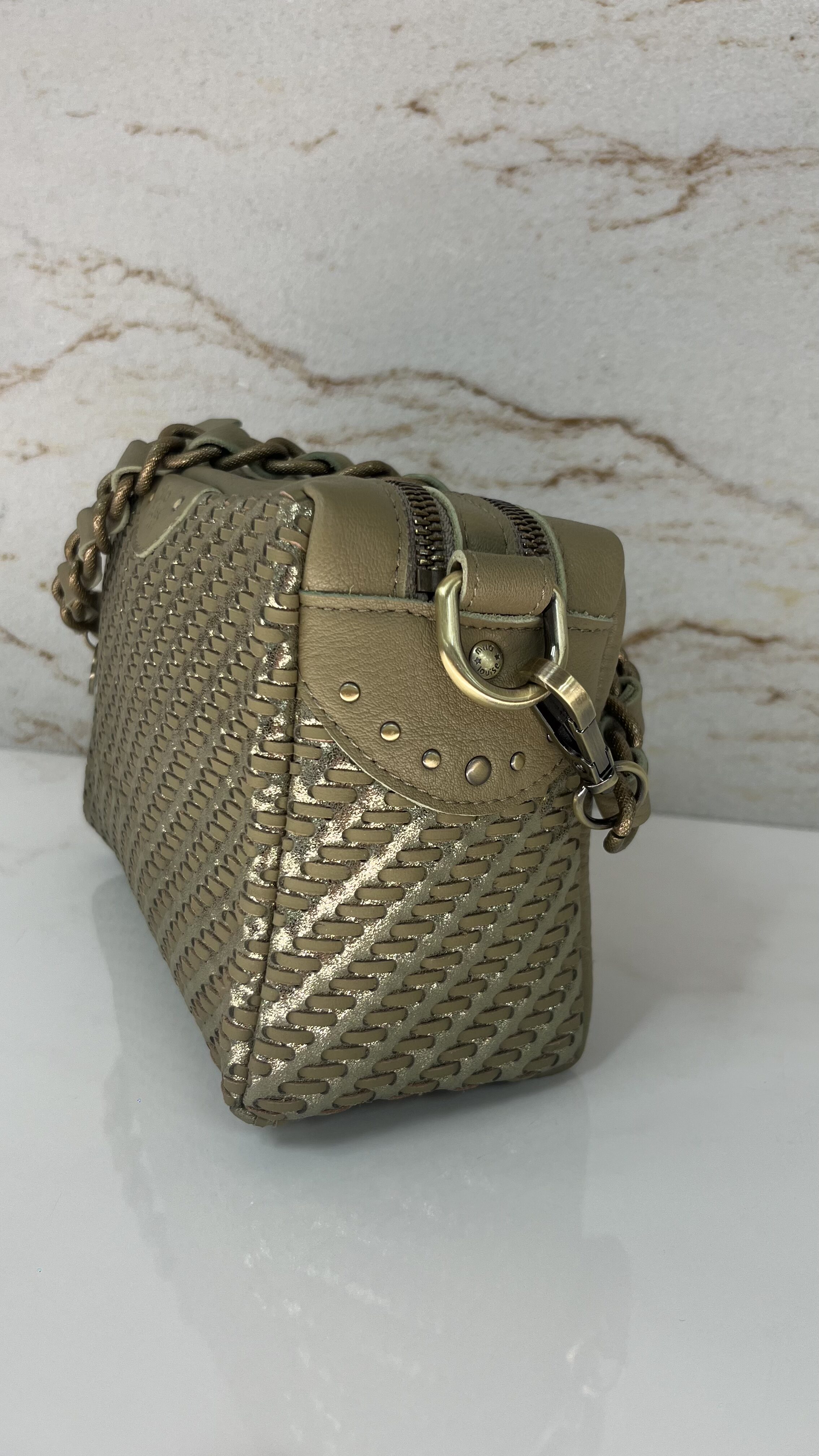– Anse en chaîné ornée de cuir tressé