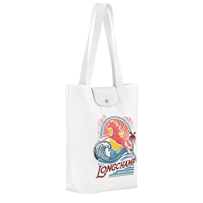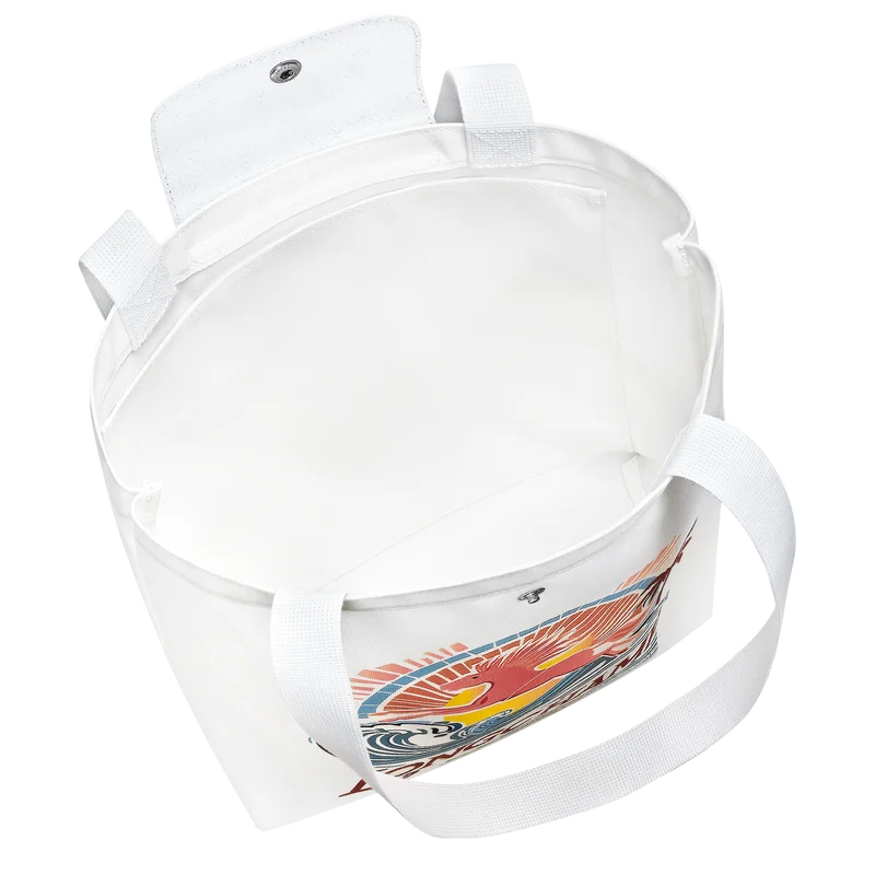 Le cabas vertical Le Pliage incarne le sac estival par excellence, confectionné en toile de coton épaisse et résistante et sublimée par des finitions blanches ton sur ton qui renforcent son allure fraîche et saisonnière. Son imprimé solaire délavé met en scène le cheval emblématique de Longchamp chevauchant une vague, un clin d’œil aux journées à la plage et aux soirées d’été baignées de lumière dorée. Doté d’une fermeture pression, d’une poche plaquée intérieure et d’un volume généreux capable d’accueillir documents A4, ordinateur portable et essentiels du quotidien, il allie avec élégance fonctionnalité et style. Rehaussé de finitions métalliques argentées et de détails en cuir de Russie, ce cabas rayonne d’une énergie solaire et d’une liberté estivale insouciante.