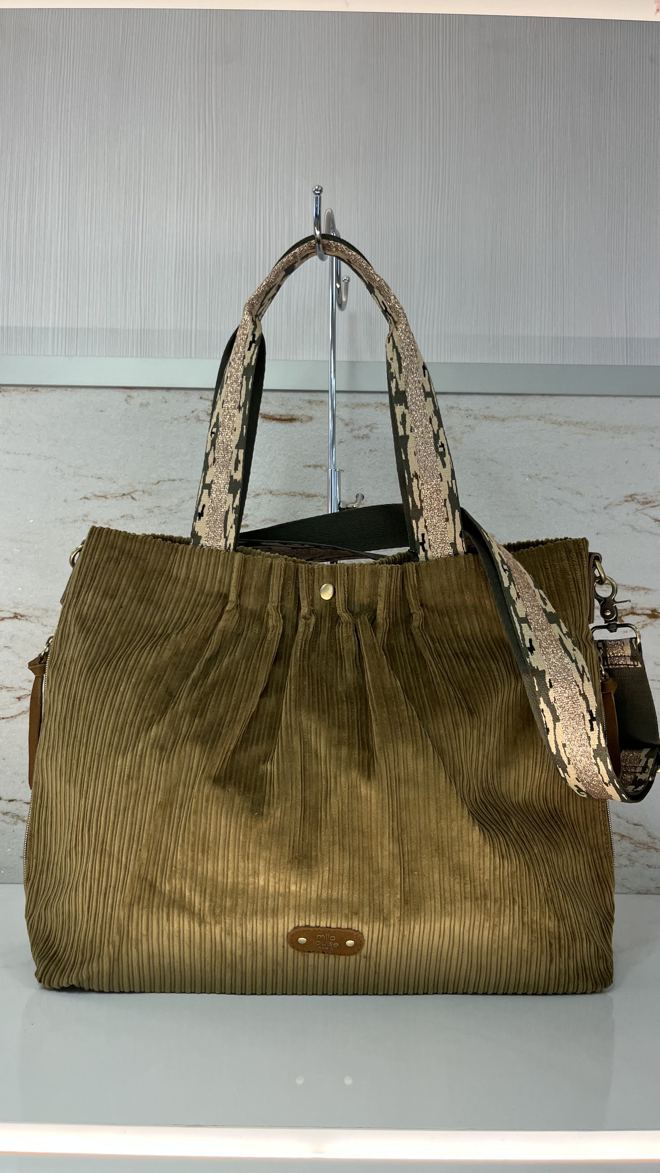 Un sac shopping et porté travers signé Mila Louise plein de douceur et de chaleur avec ce joli tissu velours côtelé et détails en cuir suédine.